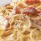 - Σουρώνουμε τα ζυμαρικά, τα ρίχνουμε στο τηγάνι με την κρέμα γάλακτος, και προσθέτουμε λίγο από το νερό που κρατήσαμε πριν και ανακατεύουμε