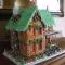 - Ανοίγουμε με τη βοήθεια επιπλέον αλευριού τη ζύμη σε φύλλο πάχους 3-4 χιλιοστών ανάμεσα σε δύο λαδόκολλες και κόβουμε με τη βοήθεια του πατρόν τα σχέδια του σπιτιού. Μεταφέρουμε τα κομμάτια σε ταψιά στρωμένα με λαδόκολλες.
