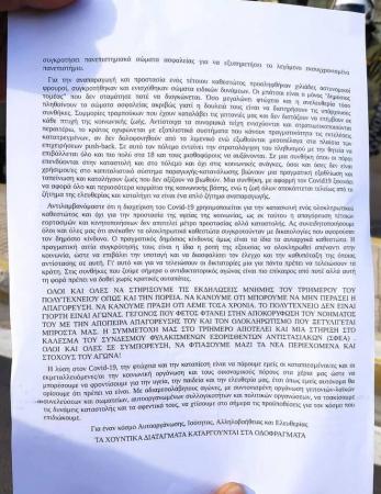 Συνελεύσεις εντός του ΠολυτεχνείουΝα σημειωθεί, επίσης, πως από χθες το βράδυ εντός του Πολυτεχνείου βρίσκονται περίπου 40 άτομα, τα οποία υποστηρίζουν ότι θα παραμείνουν στον χώρο κάνοντας συνελεύσεις. Επιπλέον, μοιράστηκαν και φυλλάδια τα οποία καλούν σε συγκέντρωση στο Πολυτεχνείο.