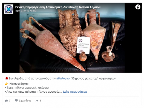Συγκεκριμένα συνελήφθη στην Κάλυμνο, από αστυνομικούς του Αστυνομικού Τμήματος Καλυμνίων, 30χρονος ημεδαπός κατηγορούμενος για παράνομη κατοχή αρχαιοτήτων.