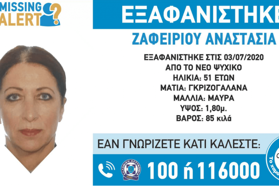 Συναγερμός έχει σημάνει στις Αρχές για την εξαφάνιση 51χρονης γυναίκας από την περιοχή του Νέου Ψυχικού.