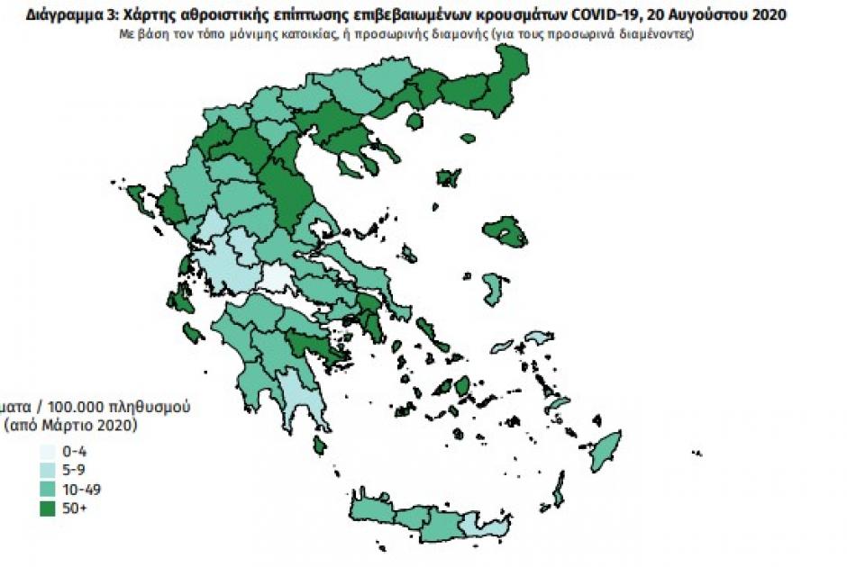 Αναλυτικά η γεωγραφική κατανομή των κρουσμάτων:Από τα 250 εγχώρια, τα 22 συνδέονται με πρόσφατο ταξίδι στο εσωτερικό της χώρας.