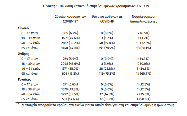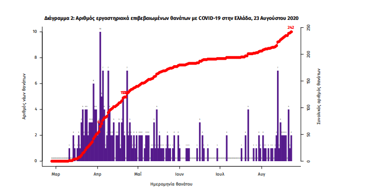 Τέλος, έχουμε 2 ακόμα καταγεγραμμένους θανάτους και 242 θανάτους συνολικά στη χώρα. 84 (34.7%) γυναίκες και οι υπόλοιποι άνδρες. Η διάμεση ηλικία των θανόντων συμπολιτών μας ήταν τα 77 έτη και το 94.6% είχε κάποιο υποκείμενο νόσημα ή/και ηλικία 70 ετών και άνω.