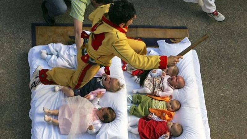 Πιο αναλυτικά, το τελετουργικό αυτής της παράξενης γιορτής έχει ως εξής: Νεαροί άντρες φορώντας κίτρινες φορεσιές, τρέχουν στον δρόμο και πηδούν πάνω από εμπόδια, τα οποία είναι βρέφη μικρότερα του ενός έτους, τοποθετημένα πάνω σε στρωματά από τους ιδίους τους γονείς.