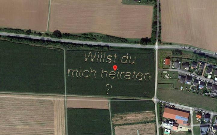 H πρόταση γάμου που έκανε ένας άνδρας στη Γερμανία πήρε μεγαλύτερες διαστάσεις και απευθύνθηκε σε ευρύτερο κοινό από ό,τι είχε σχεδιάσει, αφού εμφανίστηκε σε μία φωτογραφία από αέρα στην υπηρεσία Maps της Google.
