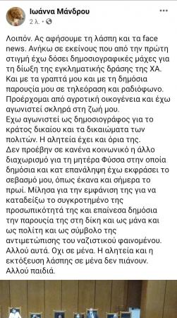 Πριν λίγη ώρα, η Ιωάννα Μάνδρου θέλησε να προχωρήσει σε μια δημόσια τοποθέτηση επί του θέματος μέσα από το facebook γράφοντας: