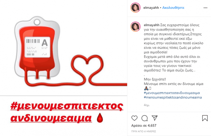 Άμα φοβάται να πάει στο νοσοκομείο, υπάρχει το εθνικό κέντρο αιμοδοσίας στην οδό Θηβών 314 στο Αιγάλεω, το οποίο είναι ανοικτό Δευτέρα – Παρασκευή από τις 15:00 έως τις 20:00», είπε η Ελένη Ασημάκη στο βίντεο που ανέβασε στα social media.