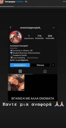 Πιο συγκεκριμένα, κάποιος χρησιμοποιώντας φωτογραφίες της άνοιξε έναν λογαριασμό στο instagram με διαφορετικό φυσικά από το δικό της όνομα.«Βγαίνω και με άλλα ονόματα. Κάντε μία αναφορά», έγραψε χαρακτηριστικά η Χαρά Παππά στην ανάρτησή της, ζητώντας από τους followers να κάνουν αναφορά για να σβηστεί το προφίλ.