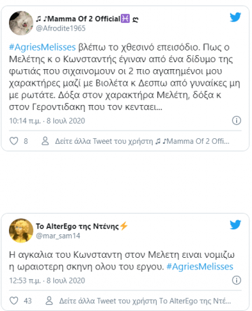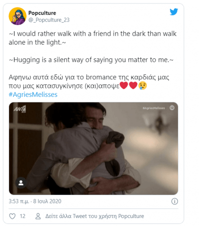 Μάλιστα, η σκηνή που είχε με τον Μελέτη, στον οποίο είπε πως έχασε έναν αδελφό και ο Θεός τού έστειλε άλλον έναν και η αγκαλιά τους, συγκίνησε και έφερε δάκρυα στο τηλεοπτικό κοινό και «λύγισε» τους χρήστες του Twitter.