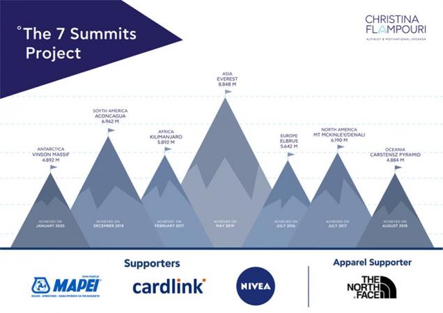 Η ιστορία της Χριστίνας μας εμπνέει καθημερινά να κυνηγήσουμε τις δικές μας κορυφές όσo μεγάλες ή μικρές και αν είναι. Η δική της ξεκίνησε τον Ιούλιο του 2016 με την ψηλότερη κορυφή της Ευρώπης - το Elbrus (5.642μ.) στην Ρωσία. Συνεχίστηκε στην ψηλότερη κορυφή της Αφρικής - το Kilimanjaro (5.895μ.) στην Τανζανία-, την ψηλότερη της Β. Αμερικής - το Denali (6.194μ.) στην Αλάσκα-, την ψηλότερη κορυφή της Ωκεανίας - το Carstensz Pyramid (4.884μ.) στην Παπούα - και την ψηλότερη της Νοτίου Αμερικής - την Aconcagua (6.962μ.) στην Αργεντινή. Τον Μάιο του 2019 έγινε η πρώτη Ελληνίδα που πάτησε στην ψηλότερη κορυφή του κόσμου, στο Έβερεστ (8.848μ.), ενώ παράλληλα, εκτός project, ήταν η πρώτη Ελληνίδα που ανέβηκε στην κορυφή Λότσε, την 4η ψηλότερη κορυφή του κόσμου, παίρνοντας συνάμα ακόμη μία πρωτιά: την ανάβαση σε δύο κορυφές άνω των 8.000μ. σε διάστημα μόνο 6 ημερών, επίτευγμα που κανένας άλλος Έλληνας δεν έχει καταφέρει.
