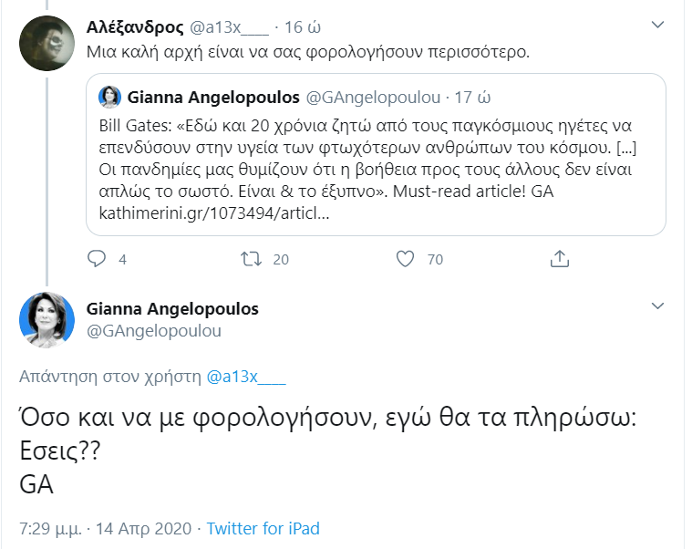 Η «σιδηρά κυρία» κοινοποίησε το άρθρο του Μπιλ Γκέιτς στην Καθημερινή, ο οποίος υπογράμμιζε τη σημασία να θωρακιστεί η ανθρωπότητα από έναν πιθανό ιό και υπενθύμιζε πως εδώ και 20 χρόνια μιλούσε για την ανάγκη χρηματοδότησης προγραμμάτων υγείας. Ο μεγιστάνας ιδρυτής της Microsoft «έπεσε μέσα» και ο Γιάννα Αγγελοπούλου υποχρεώθηκε να αντιμετωπίσει σειρά σχολιών με την επιλογή της να ποστάρει τα λόγια του δισεκατομμυριούχου επιχειρηματία.