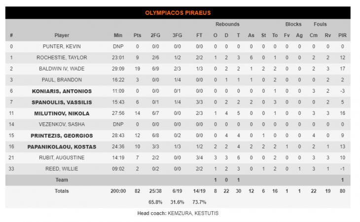 Οι "ερυθρόλευκοι" έφτασαν να προηγούνται μέχρι και δώδεκα πόντους, αλλά στο τέλος "πνίγηκαν" όταν οι γηπεδούχοι έσφιξαν την άμυνά τους. Το μόνο ευχάριστο για την ομάδα του Κεμζούρα η παρουσία του Μπόλντγουιν με 19 πόντους και καλά ποσοστά ευστοχίας.